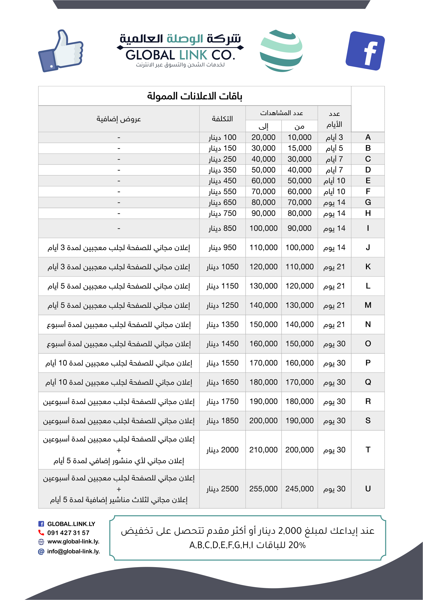 تختص شركة الوصلة العالمية في تقديم خدمات التسوق الإلكتروني والشحن حيث تقدم لعملائها الكرام عناوين شحن في الخارج يمكن لهم إستخدامها أثناء تسوقهم عبر الانترنت كذلك تقدم خدمة الدفع الإلكتروني لمن يرغب في شراء منتجات/خدمات من المواقع العالمية عبر الإنترنت، من الخدمات التي تقدمها شركة الوصلة العالمية هي ترويج صفحات الفيسبوك حيث نقدم لكم باقات متنوعة من الإعلانات الممولة عبر فيسبوك للصفحات والمنشورات كي تتحصل على عدد أكبر من المشاهدين والمتابعين لصفحتك الخاصة.